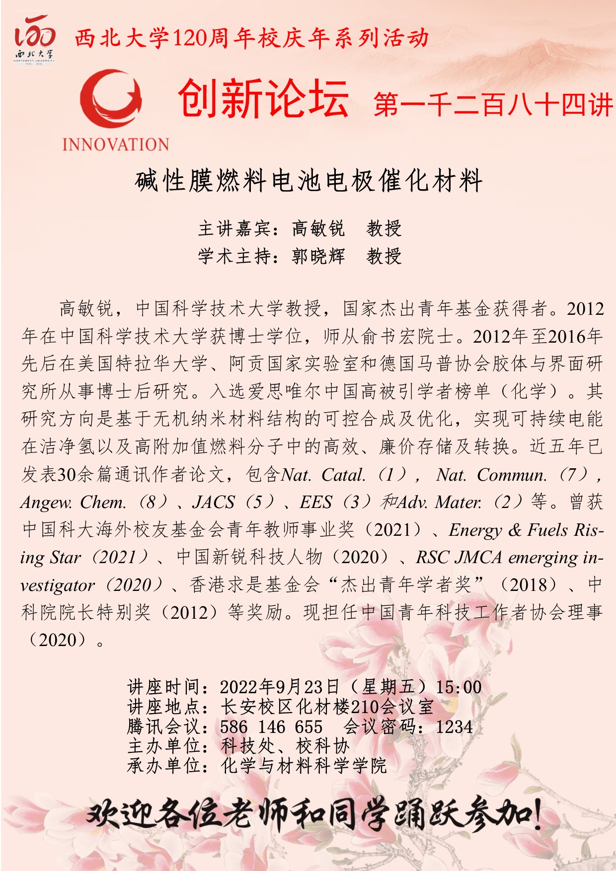 高敏锐 教授 乐投在线创新论坛第一千二百八十四讲暨120周年校庆年系列活动:碱性膜燃料电池电极催化材料 讲座时间 2022年9月21日(星期五) 15:00 讲座地点 长安校区化材楼210会议室 (腾讯会议:586 146 655 会议密码:1234) 讲座人介绍 高敏锐 教授 讲座内容