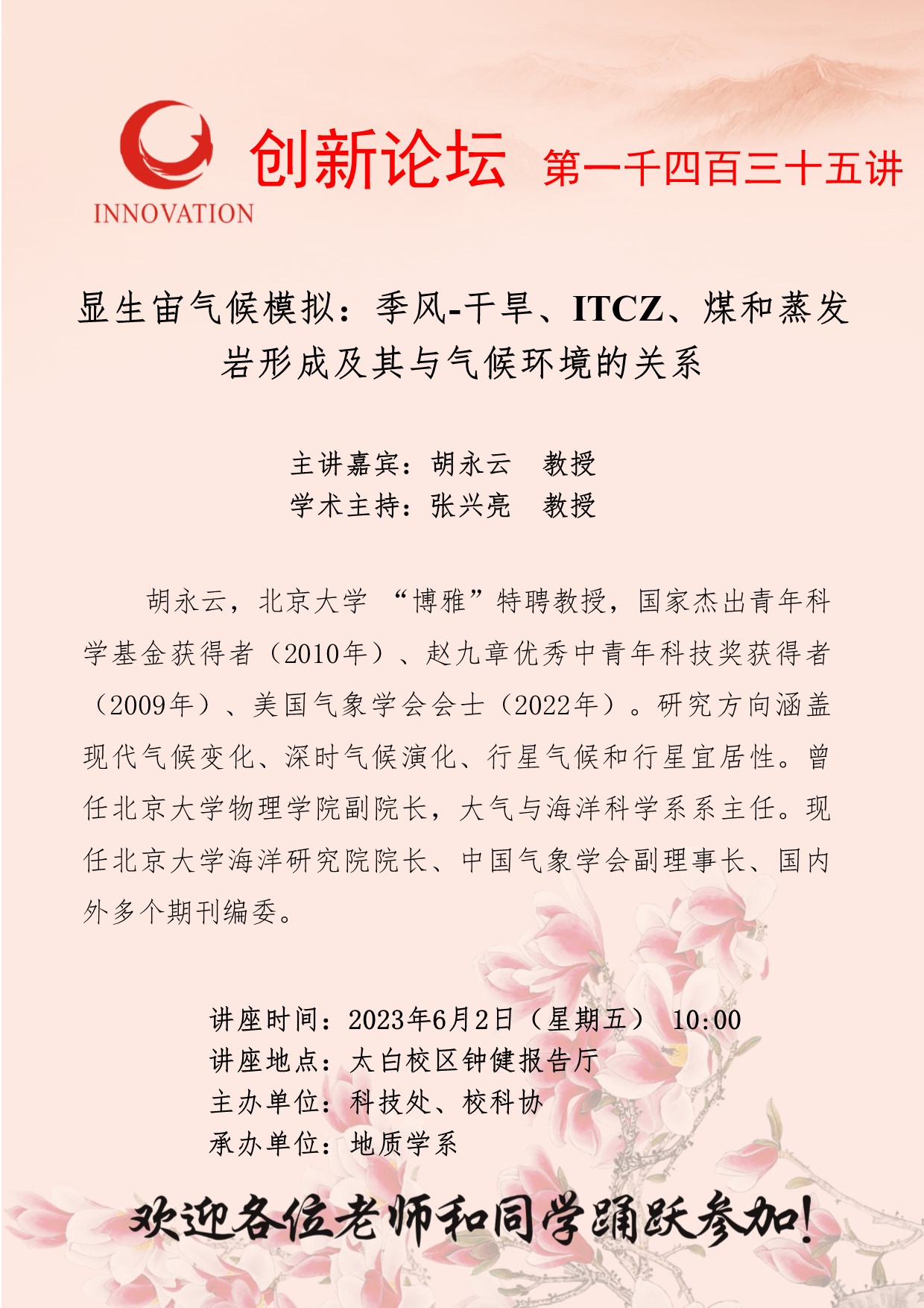 胡永云 教授 乐投在线创新论坛第一千四百三十五讲:显生宙气候模拟:季风-干旱、ITCZ、煤和蒸发岩形成及其与气候环境的关系 讲座时间 2023年6月2日(星期五) 10:00 讲座地点 太白校区钟健报告厅 讲座人介绍 胡永云 教授 讲座内容