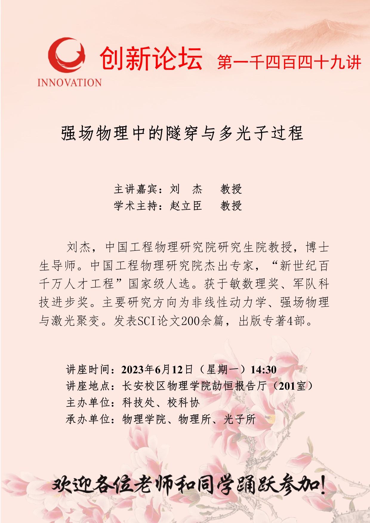 刘 杰 教授 乐投在线创新论坛第一千四百四十九讲:强场物理中的隧穿与多光子过程 讲座时间 2023年6月12日(星期一)14:30 讲座地点 长安校区物理学院劼恒报告厅(201室) 讲座人介绍 刘 杰 教授 讲座内容
