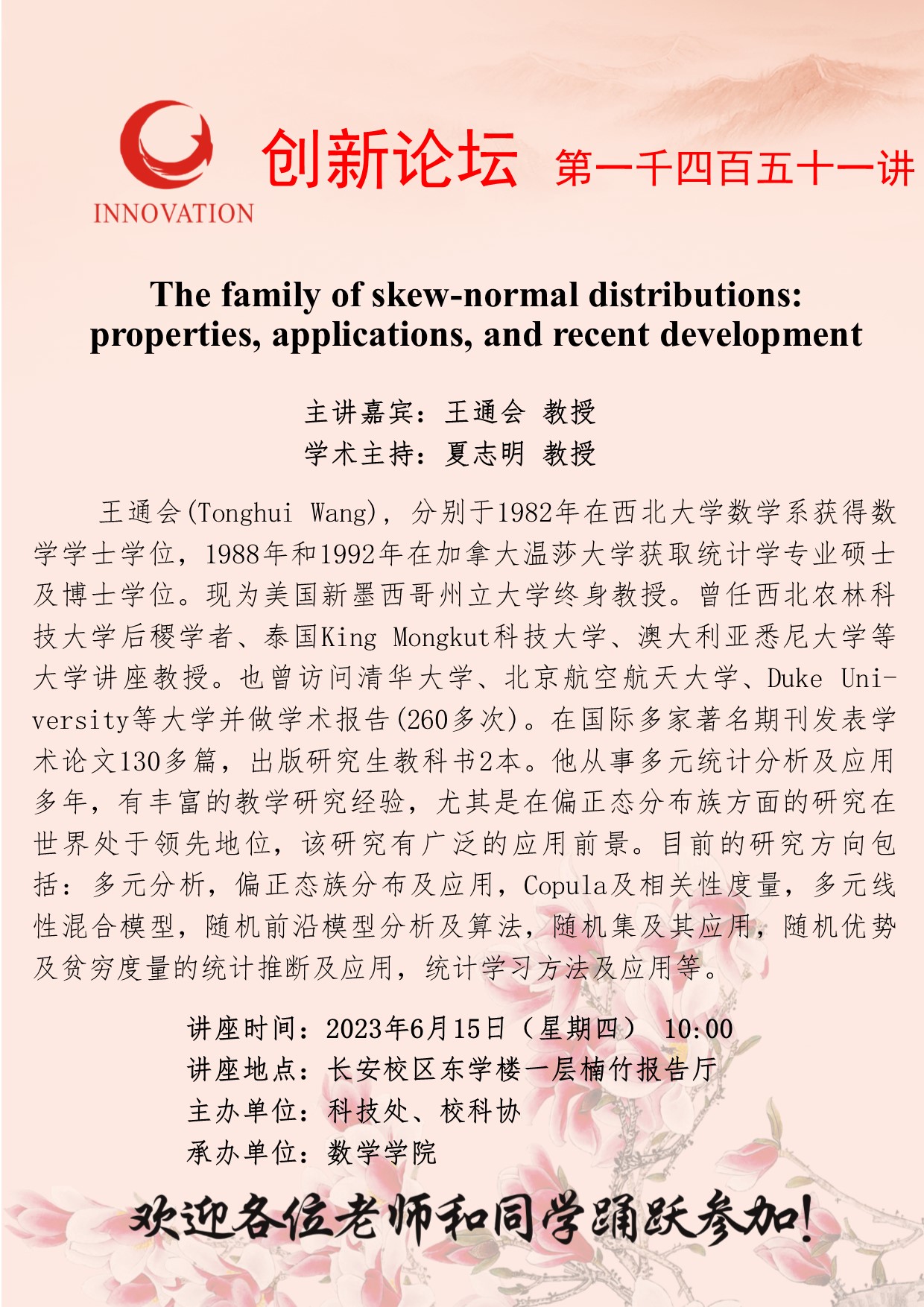 王通会 教授 乐投在线创新论坛第一千四百五十一讲:The family of skew-normal distributions: properties, applications, and recent development 讲座时间 2023年6月15日(星期四) 10:00 讲座地点 长安校区东学楼一层楠竹报告厅 讲座人介绍 王通会 教授 讲座内容