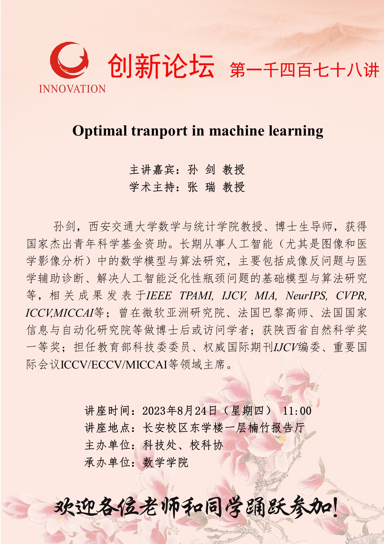 孙 剑 教授 乐投在线创新论坛第一千四百七十八讲:Optimal tranport in machine learning 讲座时间 2023年8月24日(星期四) 11:00 讲座地点 长安校区东学楼一层楠竹报告厅 讲座人介绍 孙 剑 教授 讲座内容