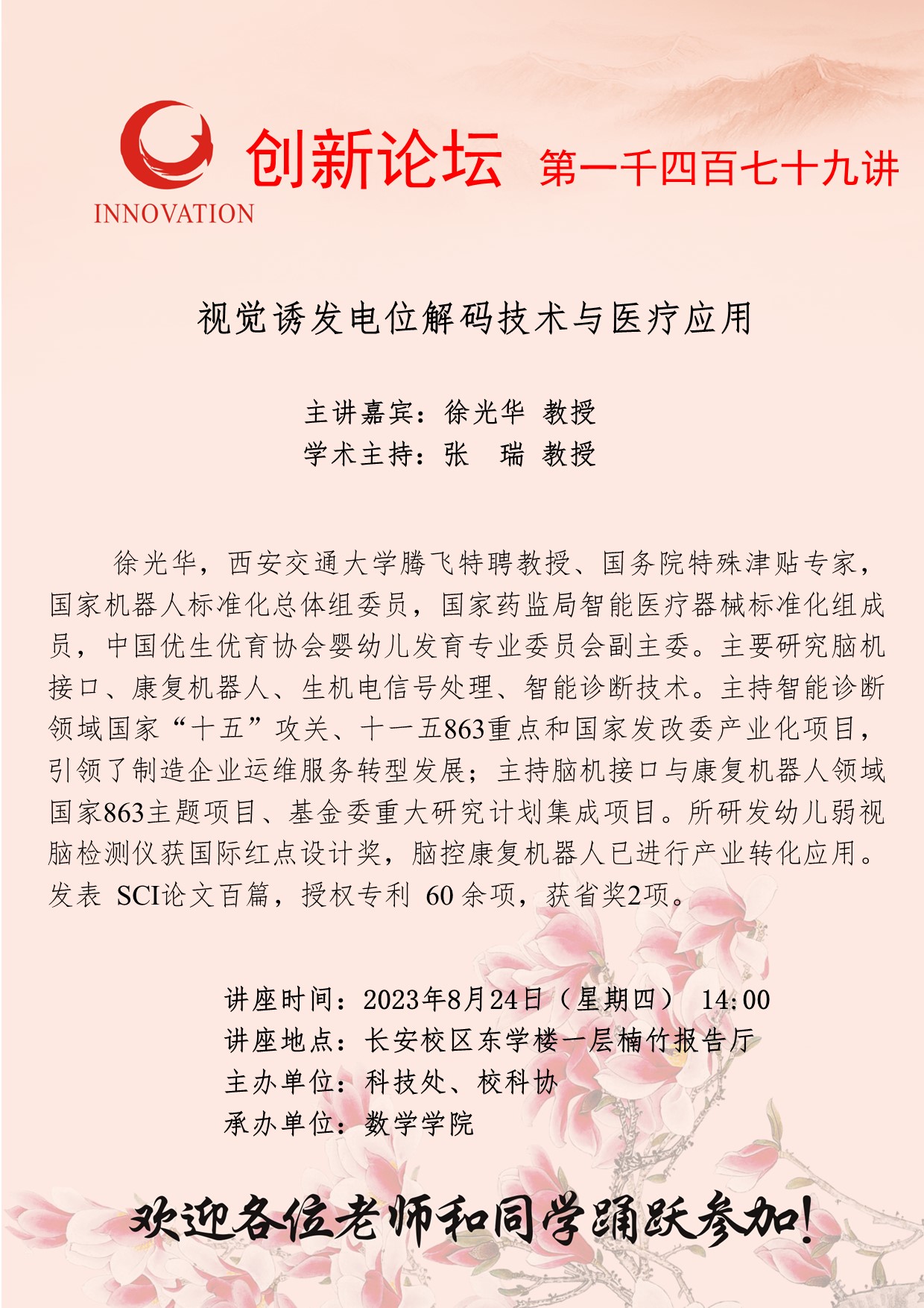徐光华 教授 乐投在线创新论坛第一千四百七十九讲:视觉诱发电位解码技术与医疗应用 讲座时间 2023年8月24日(星期四) 14:00 讲座地点 长安校区东学楼一层楠竹报告厅 讲座人介绍 徐光华 教授 讲座内容