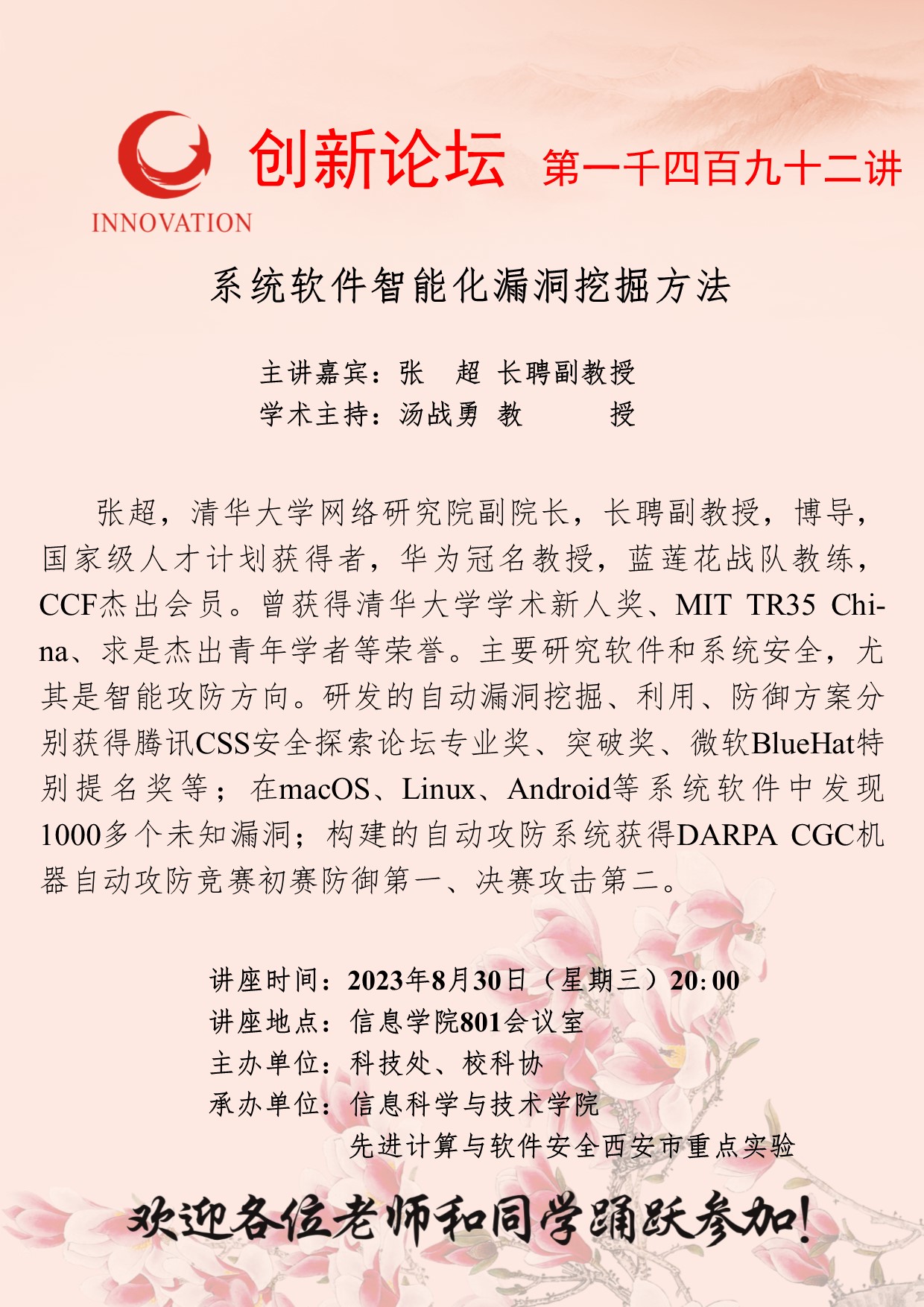 张超 长聘副教授 乐投在线创新论坛第一千四百九十二讲:系统软件智能化漏洞挖掘方法 讲座时间 2023年8月30日(星期三)20:00 讲座地点 信息学院801会议室 讲座人介绍 张超 长聘副教授 讲座内容