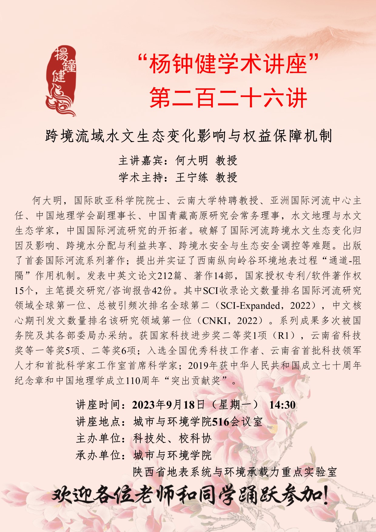 “杨钟健学术讲座”第二百二十六讲:跨境流域水文生态变化影响与权益保障机制