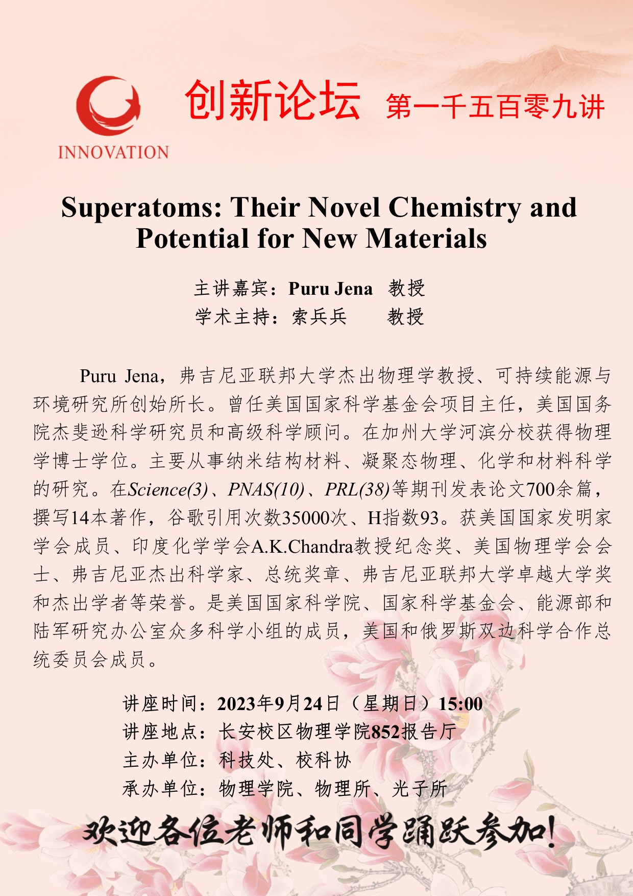 Puru Jena 教授 乐投在线创新论坛第一千五百零九讲:Superatoms: Their Novel Chemistry and Potential for New Materials 讲座时间 2023年9月24日(星期日)15:00 讲座地点 长安校区物理学院852报告厅 讲座人介绍 Puru Jena 教授 讲座内容