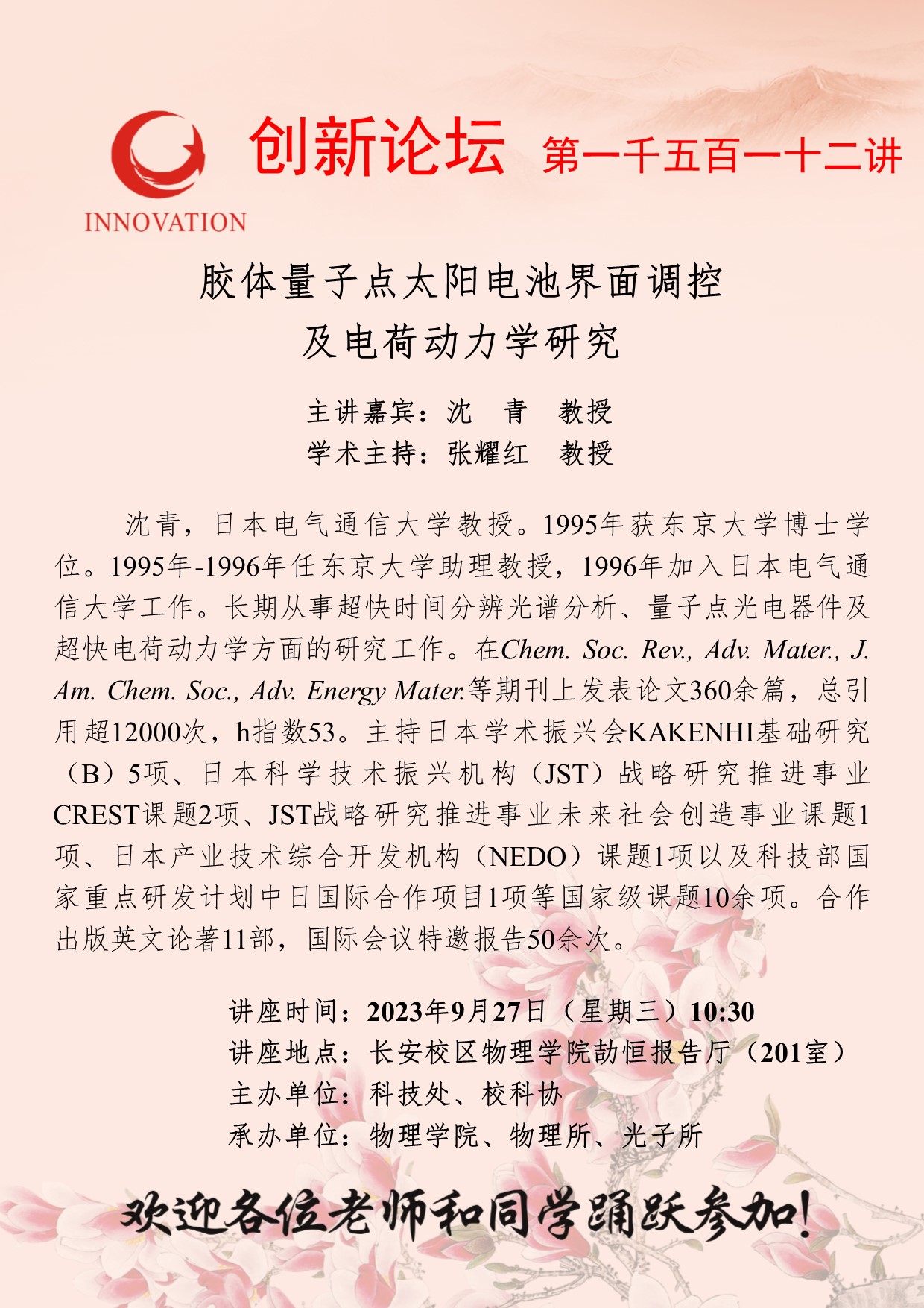 沈青 教授 乐投在线创新论坛第一千五百一十二讲:胶体量子点太阳电池界面调控及电荷动力学研究 讲座时间 2023年9月27日(星期三)10:30 讲座地点 长安校区物理学院劼恒报告厅(201室) 讲座人介绍 沈青 教授 讲座内容