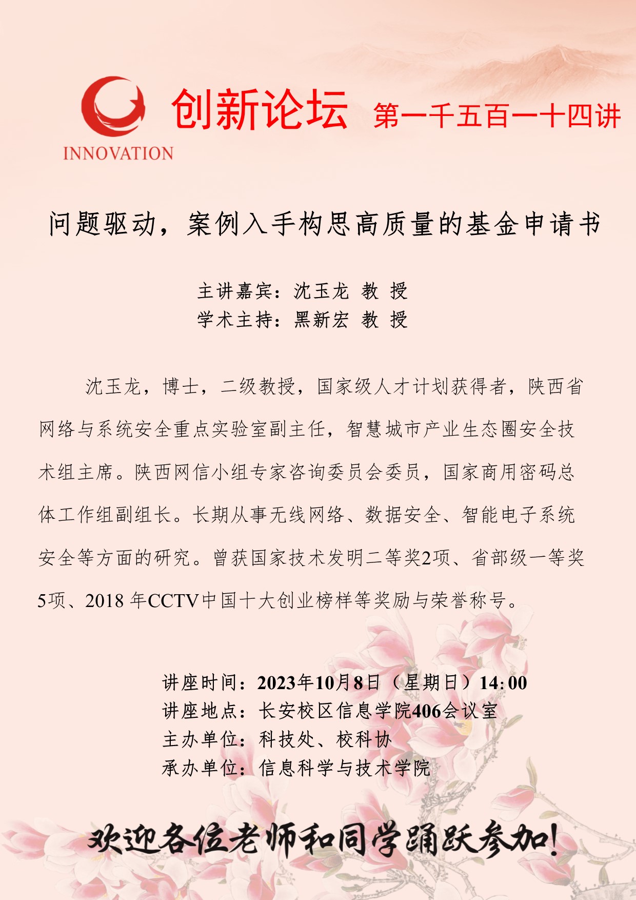 沈玉龙 教 授 乐投在线创新论坛第一千五百一十四讲: 问题驱动,案例入手构思高质量的基金申请书 讲座时间 2023年10月8日(星期日)14:00 讲座地点 长安校区信息学院406会议室 讲座人介绍 沈玉龙 教 授 讲座内容