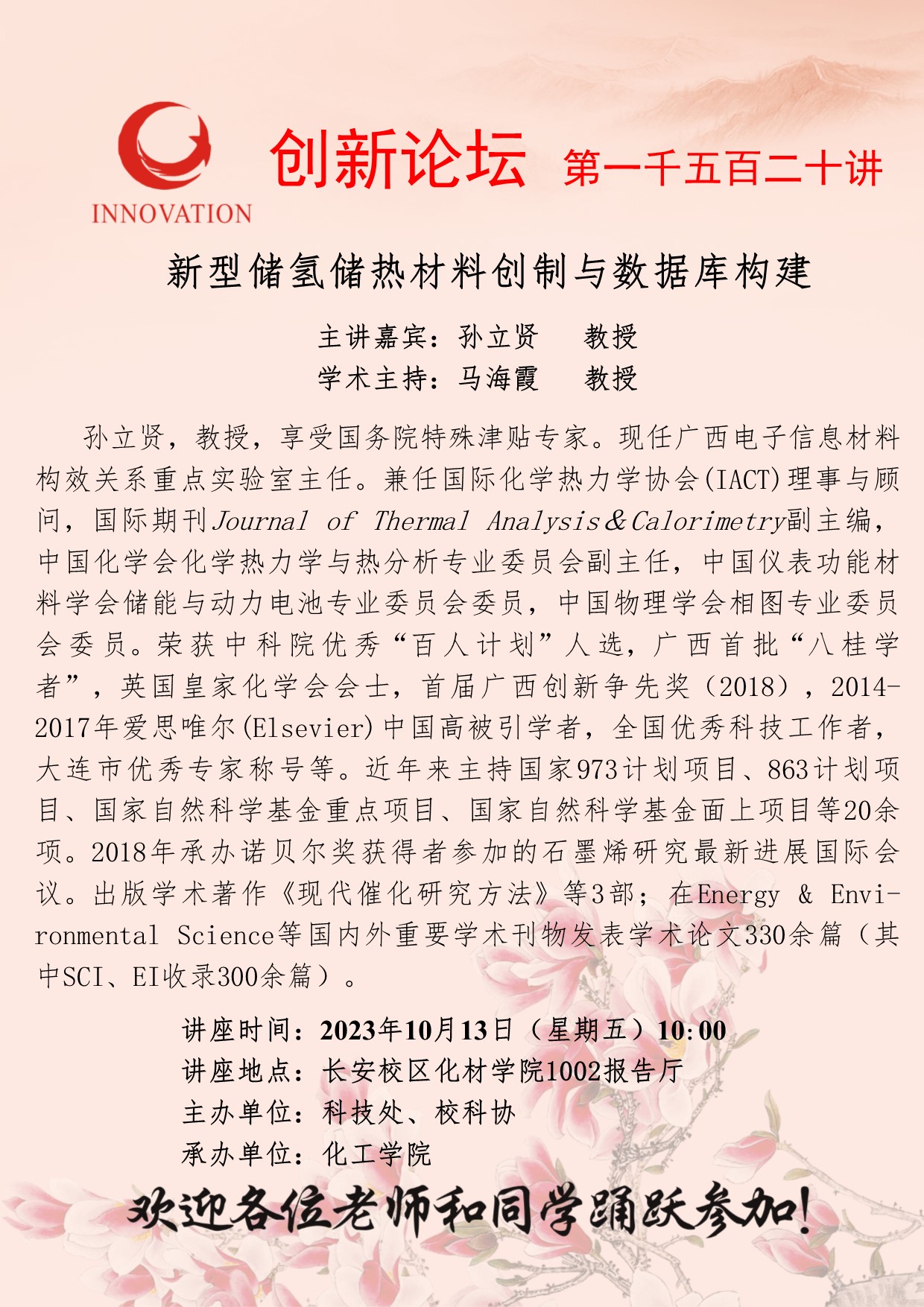 孙立贤 教授 乐投在线创新论坛第一千五百二十讲:新型储氢储热材料创制与数据库构建 讲座时间 2023年10月13日(星期五)10:00 讲座地点 长安校区化材学院1002报告厅 讲座人介绍 孙立贤 教授 讲座内容