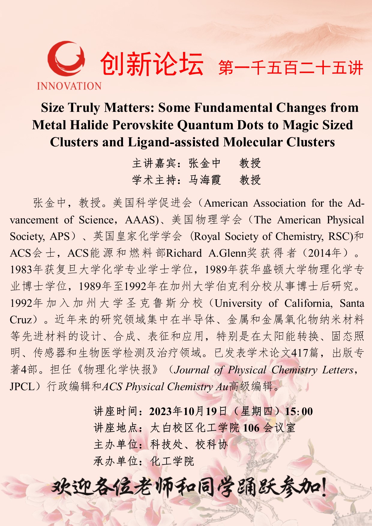 张金中 教授 乐投在线创新论坛第一千五百二十五讲:Size Truly Matters: Some Fundamental Changes from Metal Halide Perovskite Quantum Dots to Magic Sized Clusters and Ligand-assisted Molecular Clusters 讲座时间 2023年10月19日(星期四)15:00 讲座地点 太白校区化工学院106会议室 讲座人介绍 张金中 教授 讲座内容