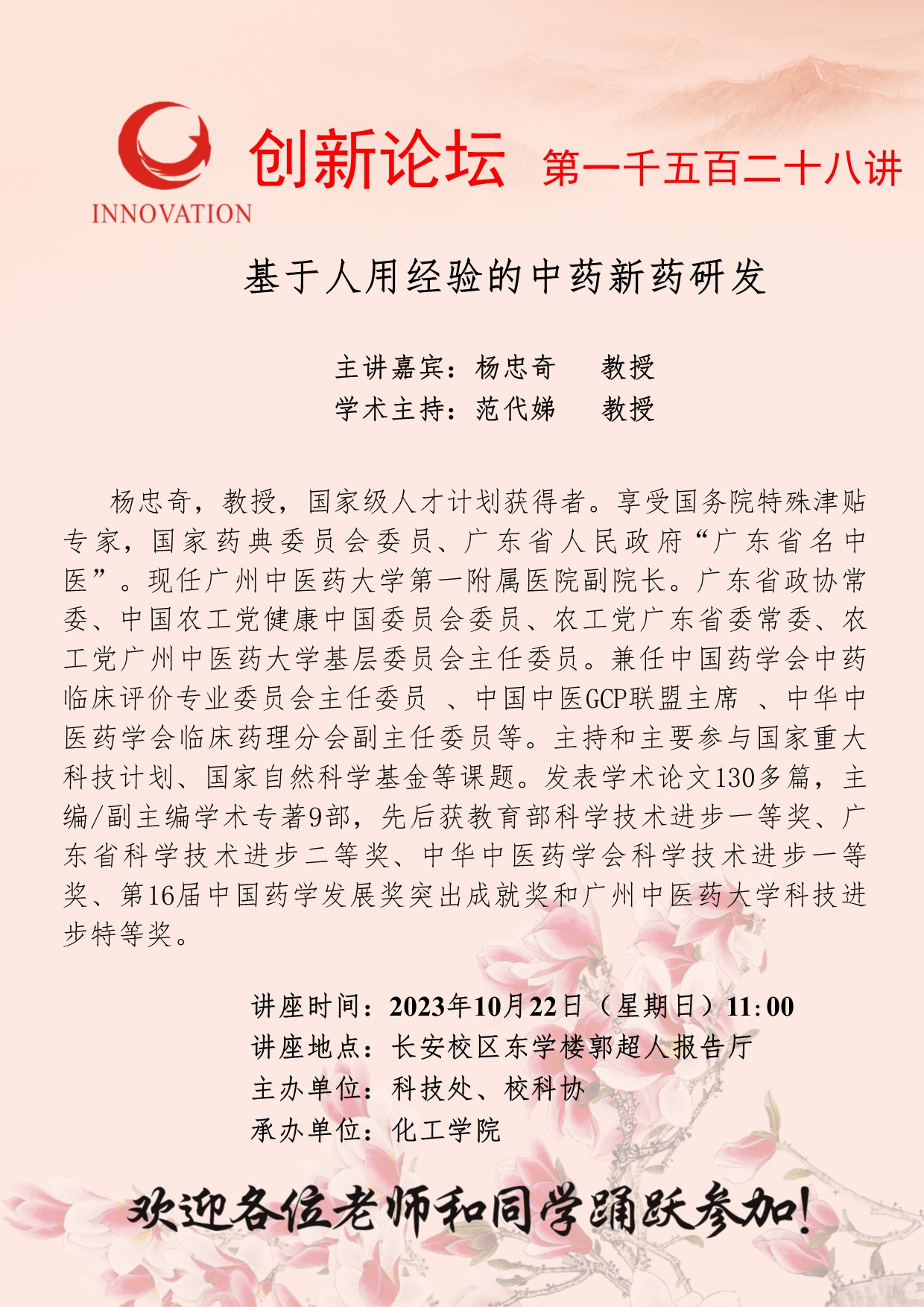 杨忠奇 教授 乐投在线创新论坛第一千五百二十八讲:基于人用经验的中药新药研发 讲座时间 2023年10月22日(星期日)11:00 讲座地点 长安校区东学楼郭超人报告厅 讲座人介绍 杨忠奇 教授 讲座内容