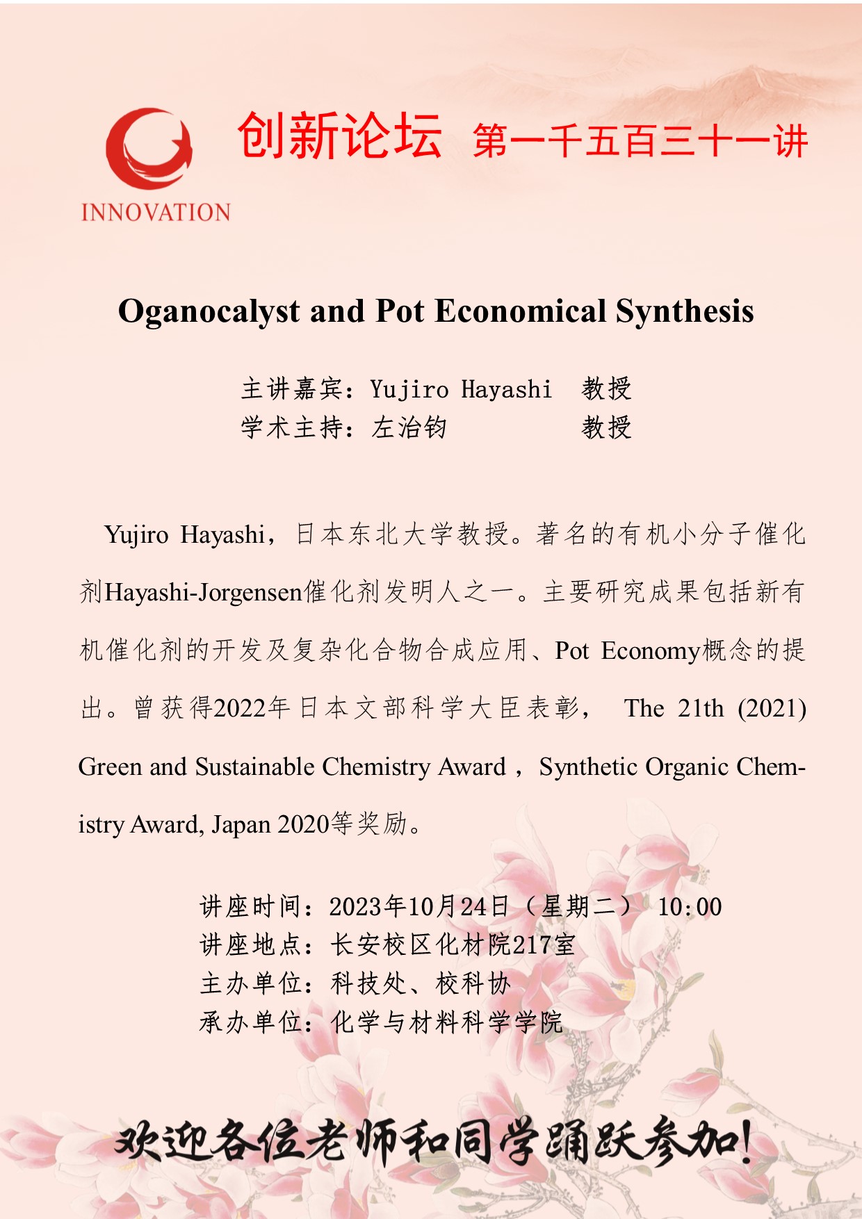 Yujiro Hayashi 教授 乐投在线创新论坛第一千五百三十一讲:Oganocalyst and Pot Economical Synthesis 讲座时间 2023年10月24日(星期二) 10:00 讲座地点 长安校区化材院217室 讲座人介绍 Yujiro Hayashi 教授 讲座内容