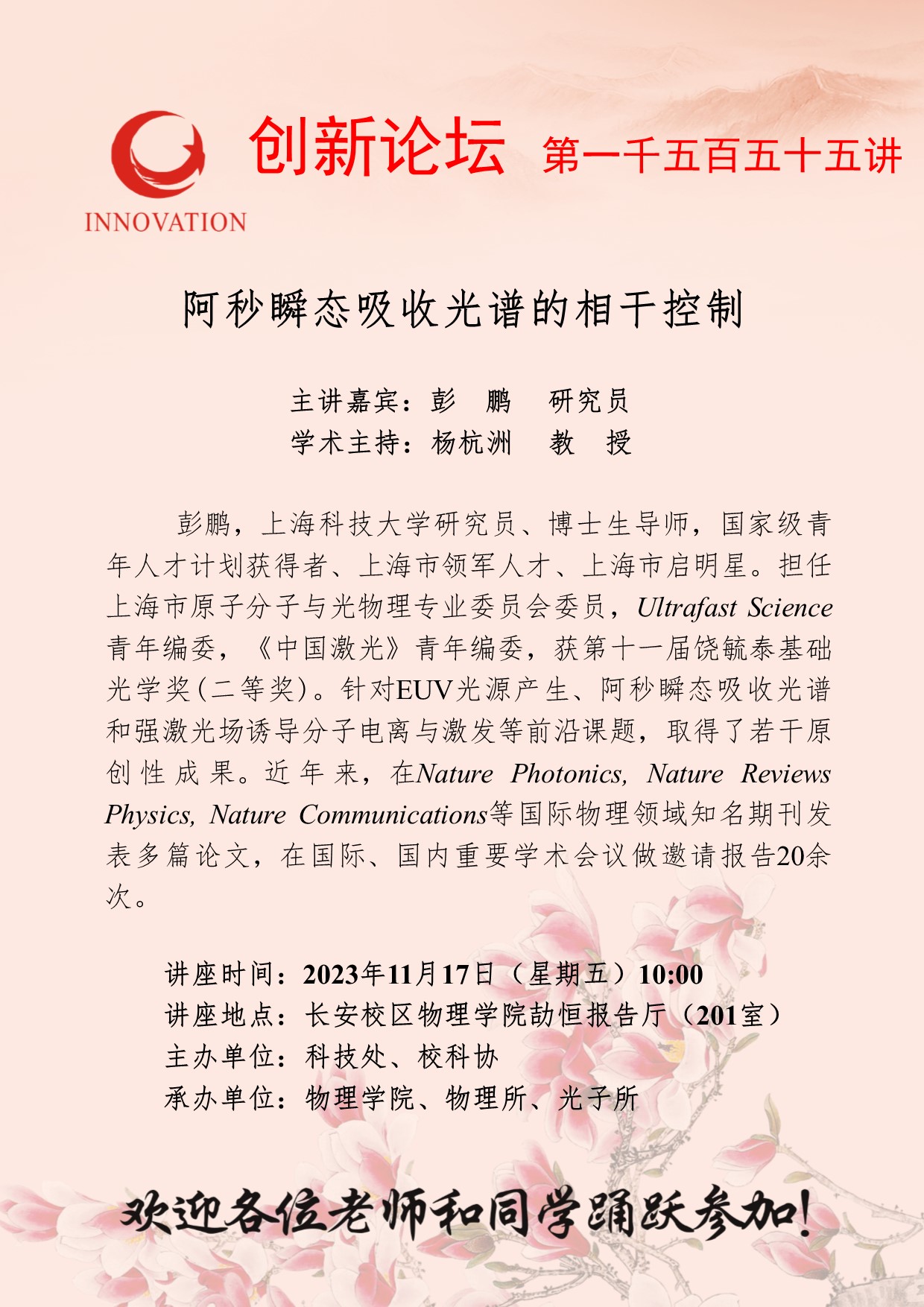 彭鹏 研究员 乐投在线创新论坛第一千五百五十五讲:阿秒瞬态吸收光谱的相干控制 讲座时间 2023年11月17日(星期五)10:00 讲座地点 长安校区物理学院劼恒报告厅(201室) 讲座人介绍 彭鹏 研究员 讲座内容