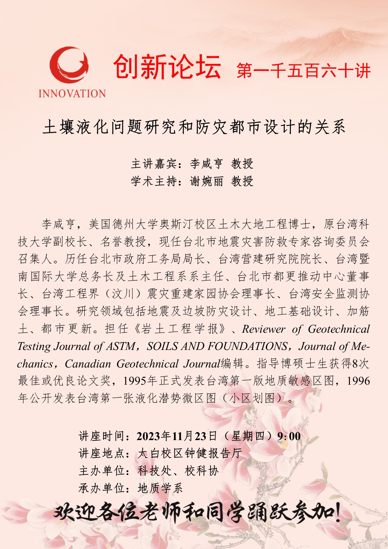 李咸亨 教授 乐投在线创新论坛第一千五百六十讲:土壤液化问题研究和防灾都市设计的关系 讲座时间 2023年11月23日(星期四)9:00 讲座地点 太白校区钟健报告厅 讲座人介绍 李咸亨 教授 讲座内容