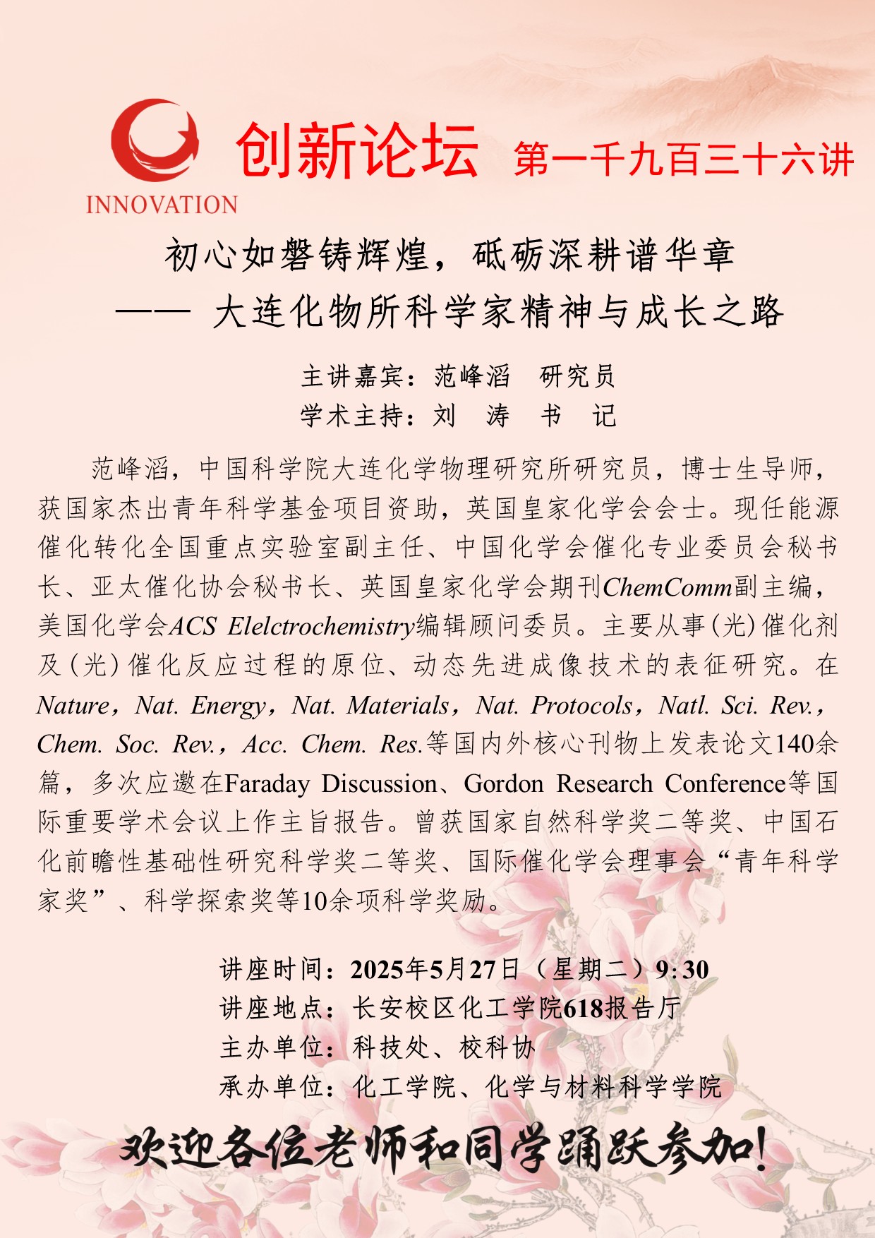 范峰滔 研究员 乐投在线创新论坛第一千九百三十六讲:初心如磐铸辉煌,砥砺深耕谱华章——大连化物所科学家精神与成长之路 讲座时间 2025年5月27日(星期二)9:30 讲座地点 长安校区化工学院618报告厅 讲座人介绍 范峰滔 研究员 讲座内容