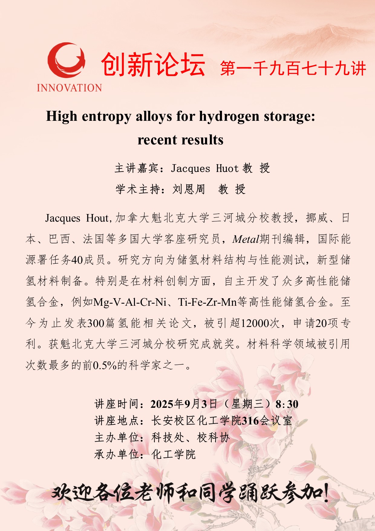 Jacques Huot 教授 乐投在线创新论坛第一千九百七十九讲:High entropy alloys for hydrogen storage: recent results 讲座时间 2025年9月3日(星期三)8:30 讲座地点 长安校区化工学院316会议室 讲座人介绍 Jacques Huot 教授 讲座内容