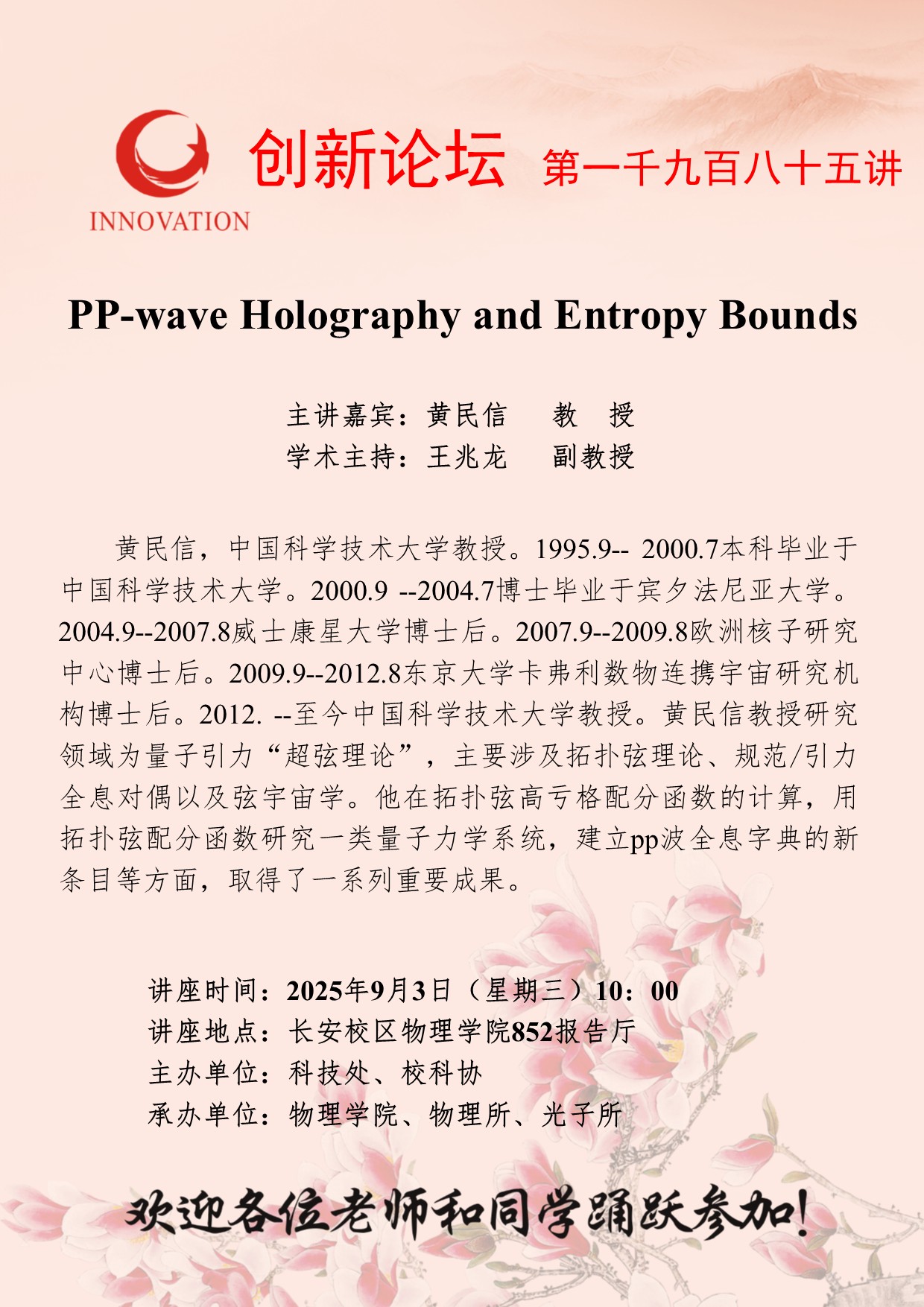 黄民信 教授 乐投在线创新论坛第一千九百八十五讲:PP-wave Holography and Entropy Bounds 讲座时间 2025年9月3日(星期三)10:00 讲座地点 长安校区物理学院852报告厅 讲座人介绍 黄民信 教授 讲座内容