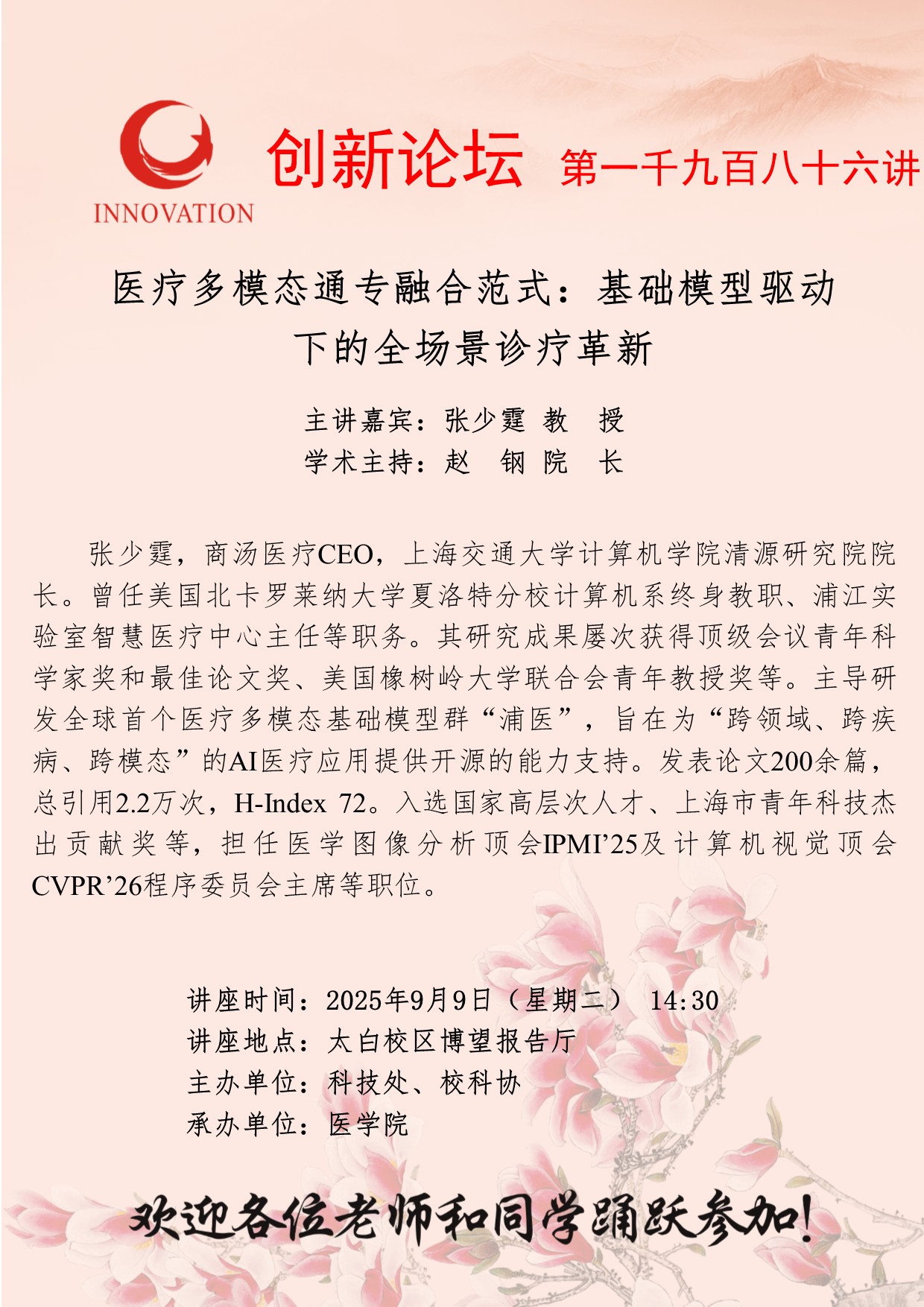张少霆 教 授 乐投在线创新论坛第一千九百八十六讲:医疗多模态通专融合范式:基础模型驱动下的全场景诊疗革新 讲座时间 2025年9月9日(星期二) 14:30 讲座地点 太白校区博望报告厅 讲座人介绍 张少霆 教 授 讲座内容 fu