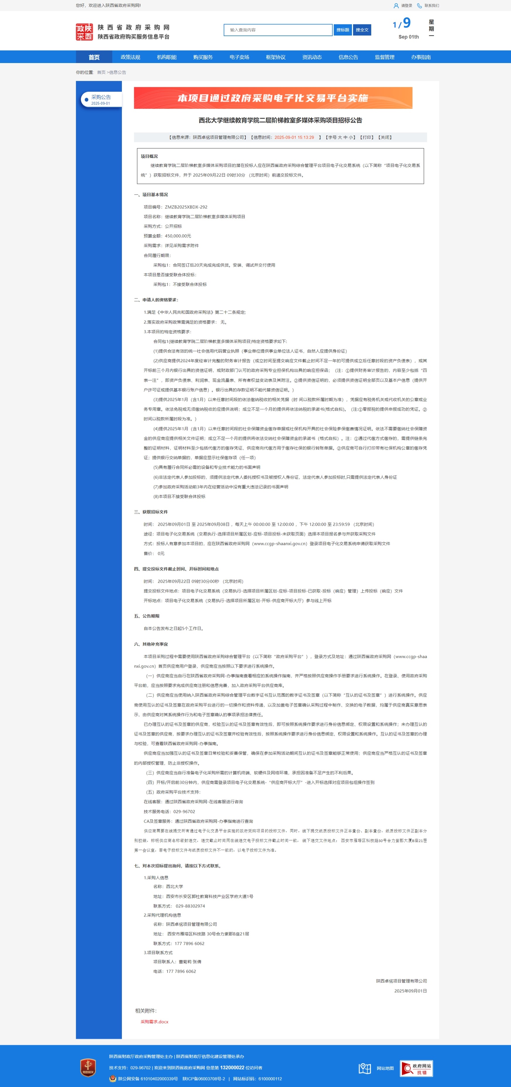 乐投在线继续教育学院二层阶梯教室多媒体采购项目招标公告 作者: 编辑: 时间:2025-09-01 原公告链接:https://www.ccgp-shaanxi.gov.cn/freecms/site/shaanxi/ggxx/info/2025/8a69c1ef98b38d03019904154b7004a7.html?noticeType=001011¬iceId=4168f35c-8705-11f0-8063-08c0eb20c666