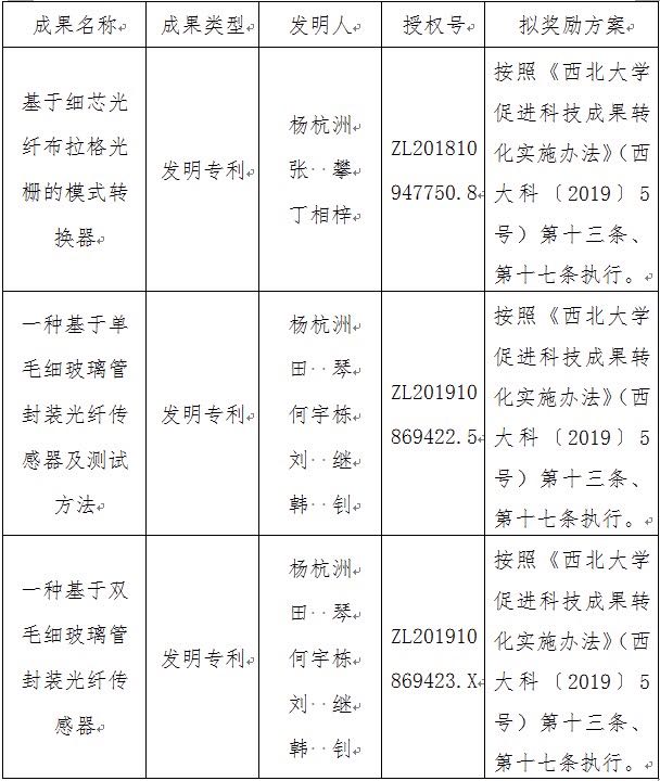 按照《乐投在线促进科技成果转化实施办法》(西大科〔2019〕5号)相关规定,拟对乐投在线物理学院杨杭洲教授作为成果负责人的3项发明专利权实施转化,现将相关信息公示如下: