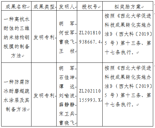 按照《乐投在线促进科技成果转化实施办法》(西大科〔2019〕5号)相关规定,拟对乐投在线化工学院胡军教授作为成果负责人的2项发明专利权实施转化,现将相关信息公示如下: