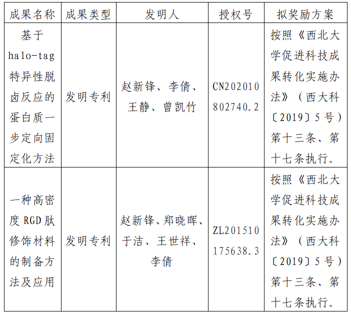 按照《乐投在线促进科技成果转化实施办法》(西大科〔2019〕5号)相关规定,拟对乐投在线生命科学学院赵新锋教授作为成果负责人的2项发明专利权实施普通许可,现将相关信息公示如下: