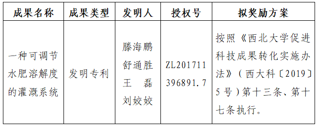 按照《乐投在线促进科技成果转化实施办法》(西大科〔2019〕5号)相关规定,拟对乐投在线化工学院滕海鹏副教授作为成果负责人的1件发明专利权实施转化,现将相关信息公示如下: