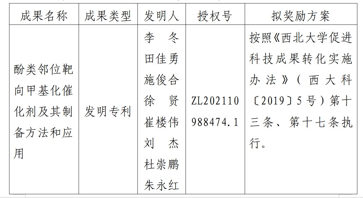 按照《乐投在线促进科技成果转化实施办法》(西大科〔2019〕5号)相关规定,拟对乐投在线化工学院李冬教授作为成果负责人的1项发明专利权实施转化,现将相关信息公示如下: