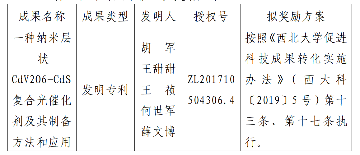 按照《乐投在线促进科技成果转化实施办法》(西大科〔2019〕5号)相关规定,拟对乐投在线化工学院胡军教授作为成果负责人的1项发明专利权实施转化,现将相关信息公示如下: