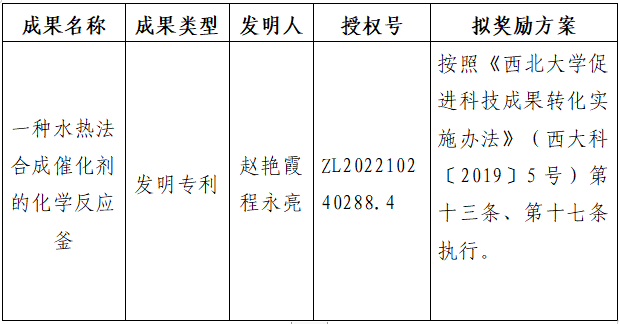 按照《乐投在线促进科技成果转化实施办法》(西大科〔2019〕5号)相关规定,拟对乐投在线化学与材料科学学院赵艳霞副教授作为成果负责人的1项发明专利权实施转化,现将相关信息公示如下: