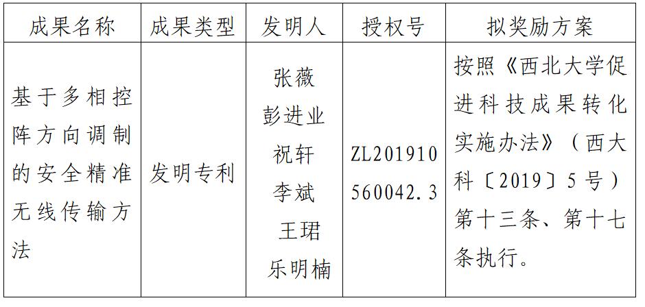 按照《乐投在线促进科技成果转化实施办法》(西大科〔2019〕5号)相关规定,拟对乐投在线信息科学与技术学院张薇老师作为成果负责人的1项发明专利权实施转化,现将相关信息公示如下: