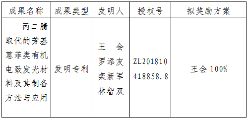 按照《乐投在线促进科技成果转化实施办法》(西大科〔2019〕5号)相关规定,拟对乐投在线化学与材料科学学院王会副教授作为成果负责人的1项发明专利权实施转化,现将相关信息公示如下: