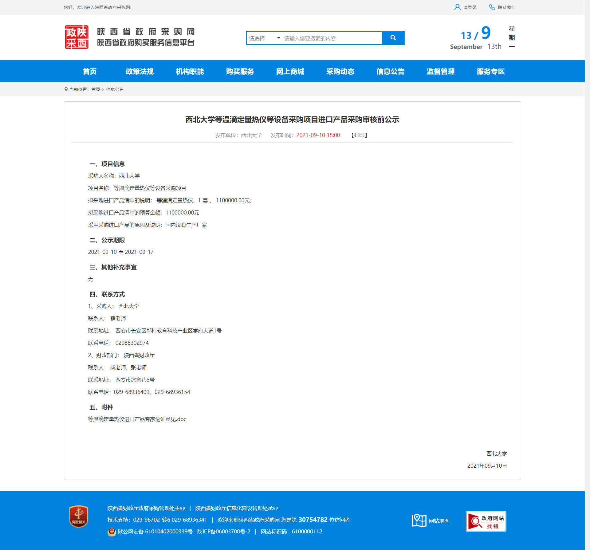 乐投在线等温滴定量热仪等设备采购项目进口产品采购审核前公示 作者: 编辑:采购与招标办公室 时间:2021-09-13 原公告地址:http://www.ccgp-shaanxi.gov.cn/notice/noticeDetail.do?noticeguid=8a85be347bc00296017bcf17c5ca1019