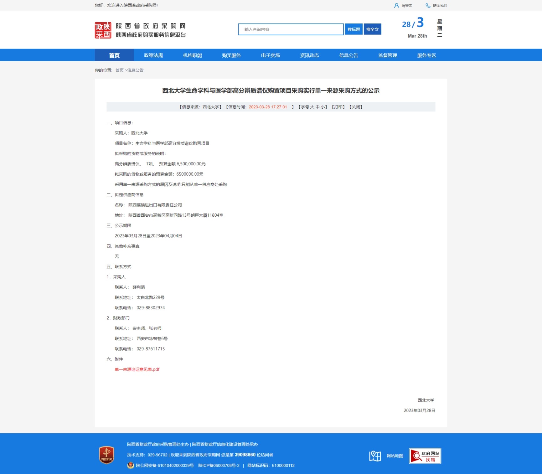 乐投在线生命学科与医学部高分辨质谱仪购置项目采购实行单一来源采购方式的公示 作者: 编辑:采购与招标办公室 时间:2023-03-28 原公告链接:http://www.ccgp-shaanxi.gov.cn/freecms/site/shaanxi/ggxx/info/2023/8a69c2018721d9cb018726d4460d78d5.html?noticeType=001051¬iceId=9b938696-cd4b-11ed-9a8e-08c0eb20c666