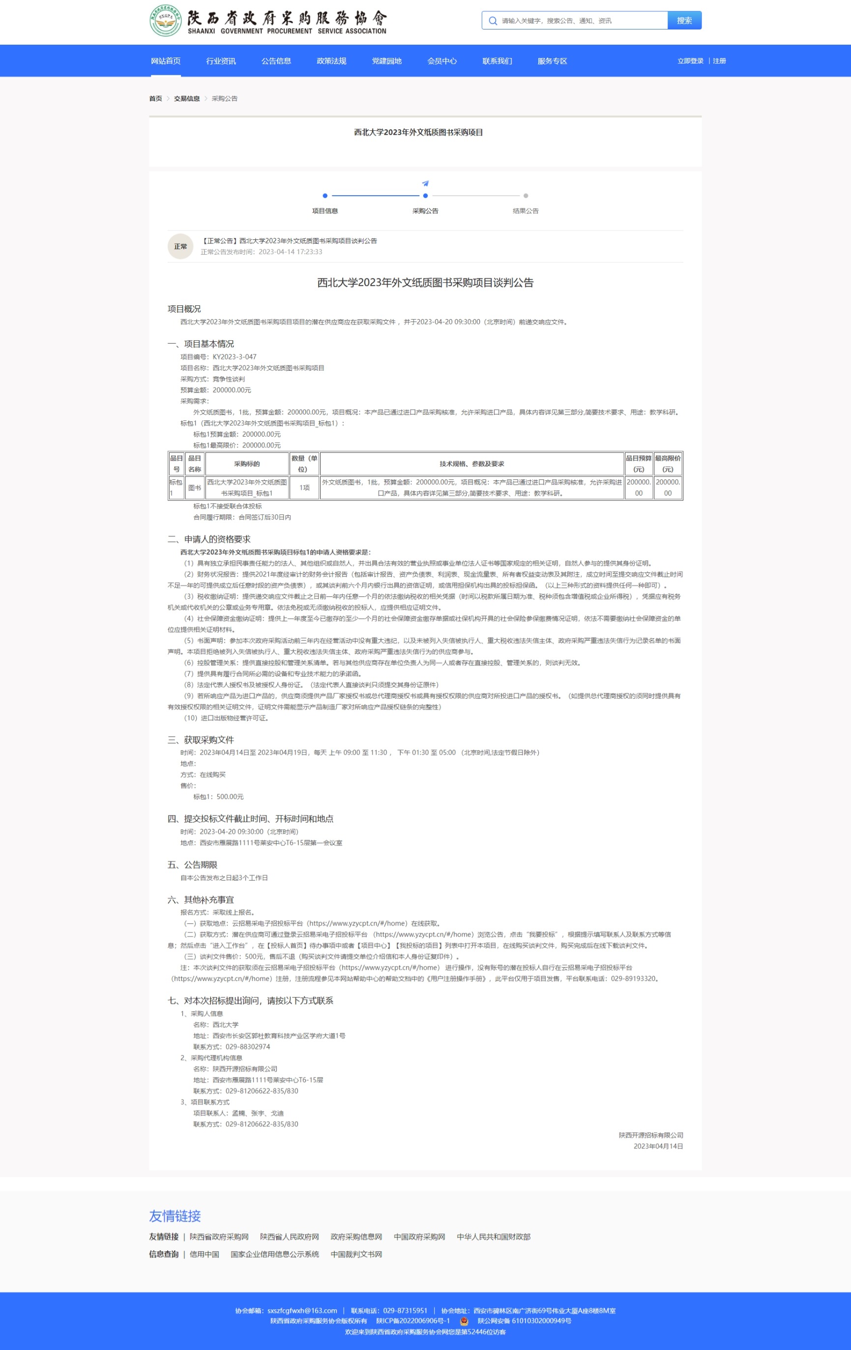 乐投在线2023年外文纸质图书采购项目谈判公告 作者: 编辑:采购与招标办公室 时间:2023-04-14 原公告链接:https://www.sxszfcgfwxh.cn/#/tender-vTradeAnnouncement-anno?tenderProjectId=1646805161369710594