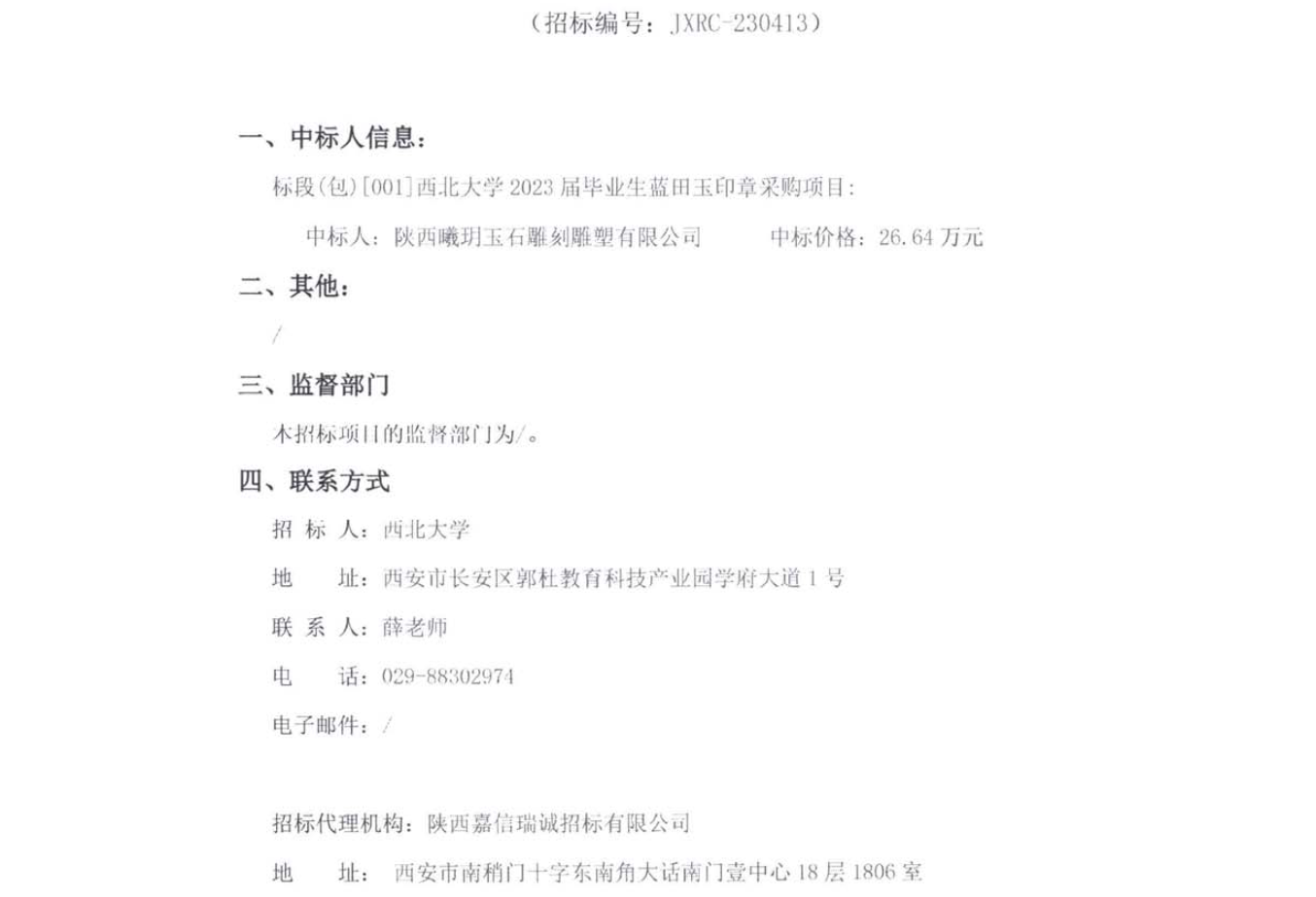 乐投在线2023届毕业生蓝田玉印章采购项目成交结果公告 作者: 编辑:采购与招标办公室 时间:2023-05-05 原公告链接:http://bulletin.sntba.com/resultBulletin/2023-05-05/554805.html