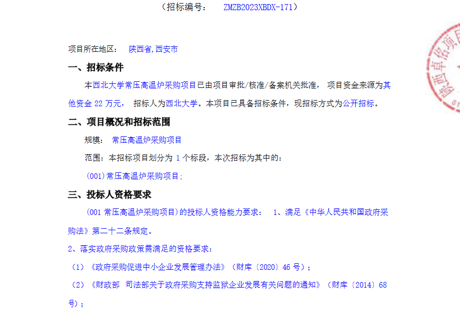 乐投在线常压高温炉采购项目公开招标公告 作者: 编辑:采购与招标办公室 时间:2023-07-11 原公告链接:http://bulletin.sntba.com/biddingBulletin/2023-07-10/582742.html