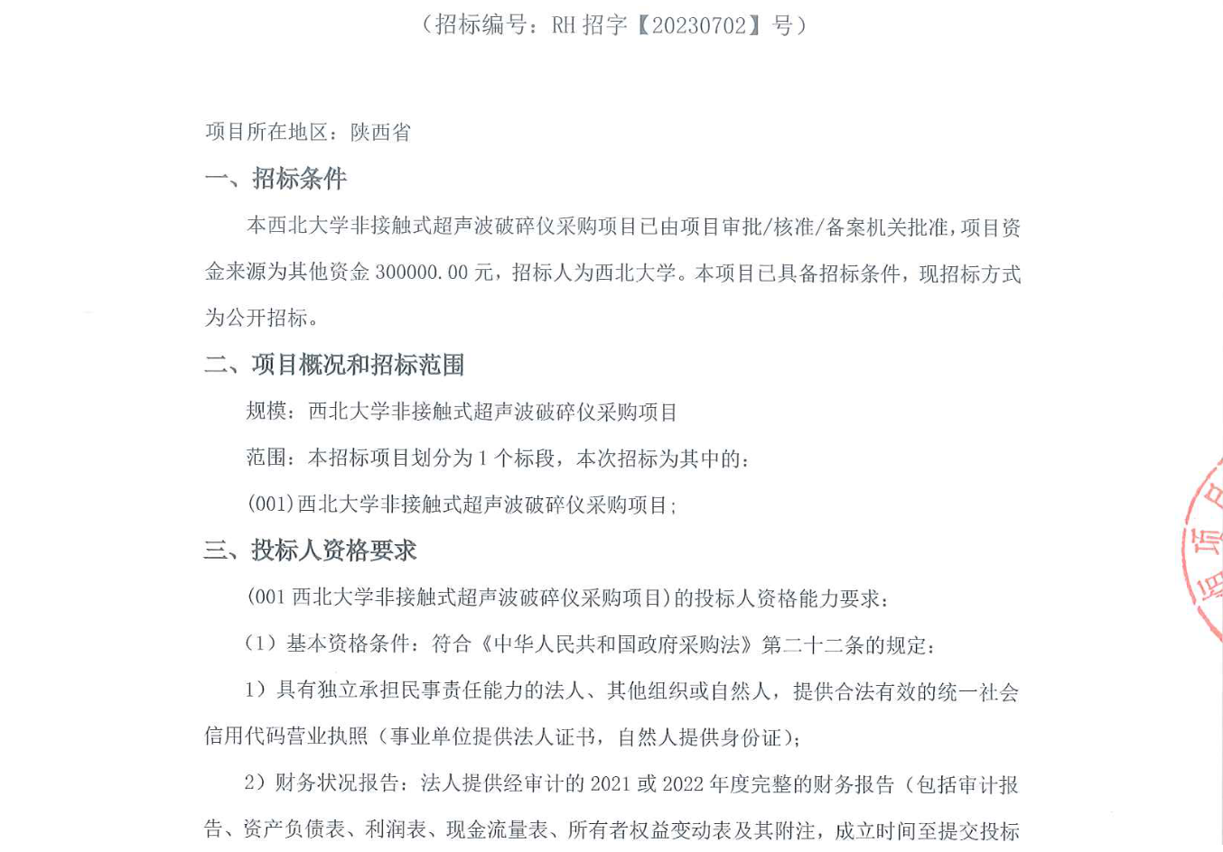乐投在线非接触式超声波破碎仪采购项目招标公告 作者: 编辑:薛利娟 时间:2023-08-06 原公告链接:http://bulletin.sntba.com/biddingBulletin/2023-08-04/603235.html