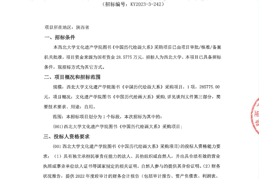 乐投在线《中国历代绘画大系》采购项目竞争性谈判公告 作者: 编辑:采购与招标办公室 时间:2023-09-15 原公告链接:http://bulletin.sntba.com/biddingBulletin/2023-09-14/664967.html