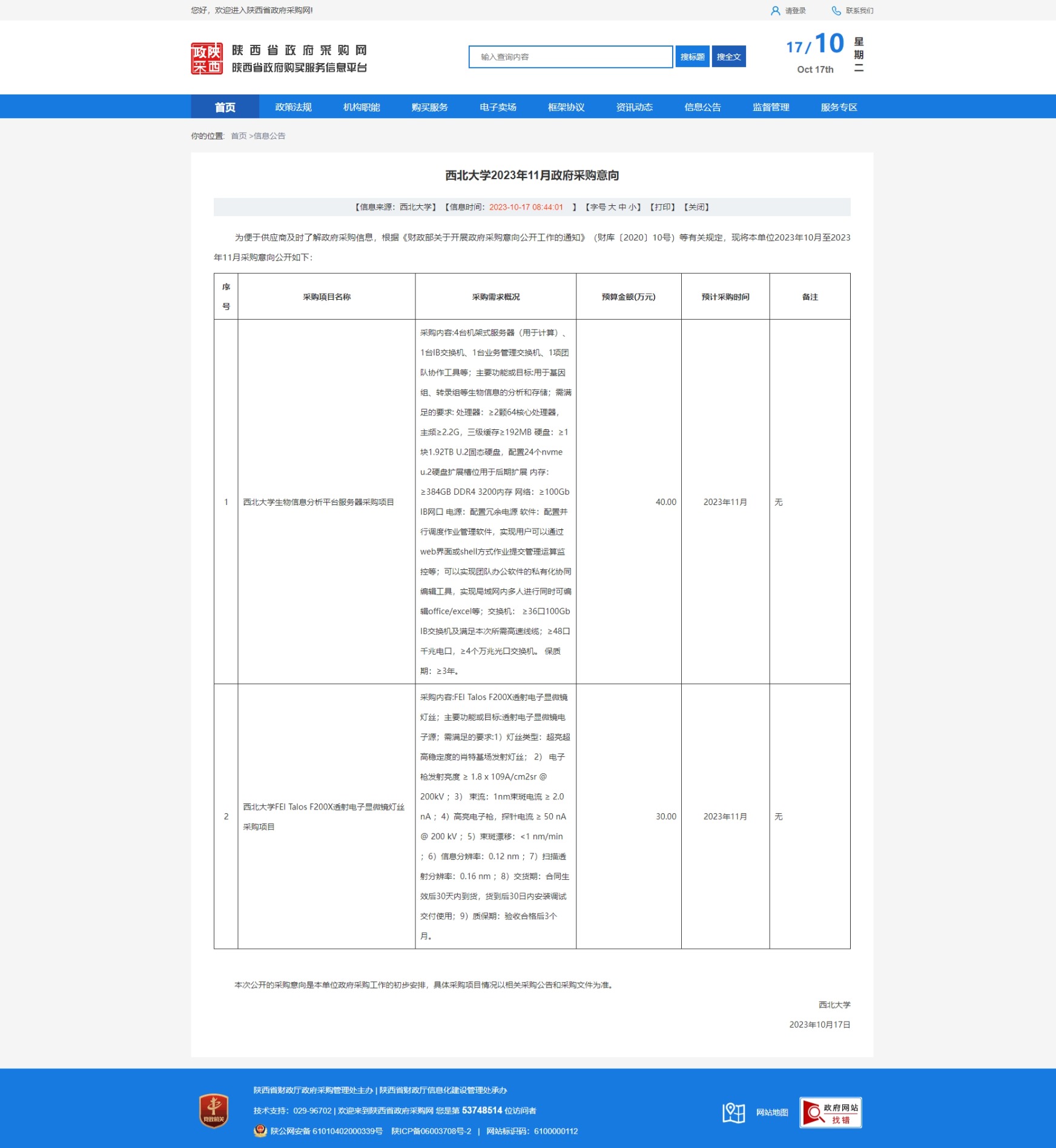 乐投在线2023年11月政府采购意向 作者: 编辑:采购与招标办公室 时间:2023-10-17 原公告链接:http://www.ccgp-shaanxi.gov.cn/freecms/site/shaanxi/ggxx/info/2023/8a69c1288b1ca82f018b1da2697d31f0.html?noticeType=59¬iceId=8cf5519b-6c87-11ee-9a8e-08c0eb20c666