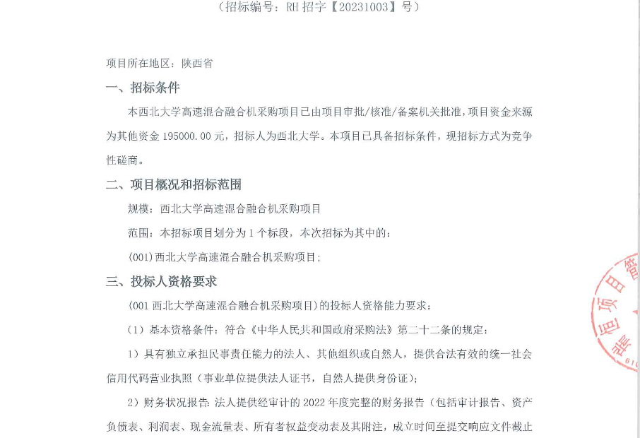 乐投在线高速混合融合机采购项目竞争性磋商公告 作者: 编辑:采购与招标办公室 时间:2023-10-18 原公告链接:http://bulletin.sntba.com/biddingBulletin/2023-10-17/735312.html