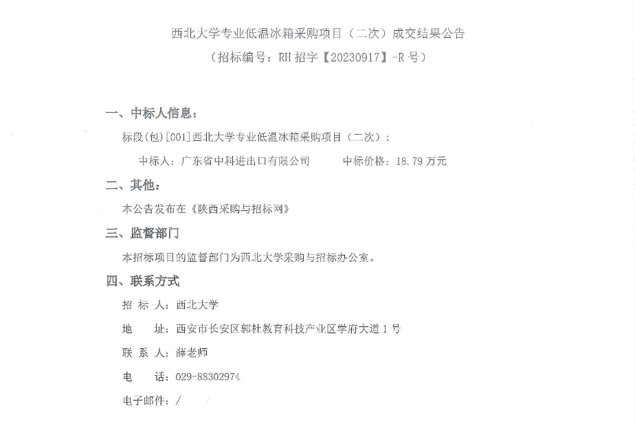 乐投在线专业低温冰箱采购项目(二次)成交结果公告 作者: 编辑: 时间:2023-11-09 原公告链接:http://bulletin.sntba.com/resultBulletin/2023-11-07/790256.html
