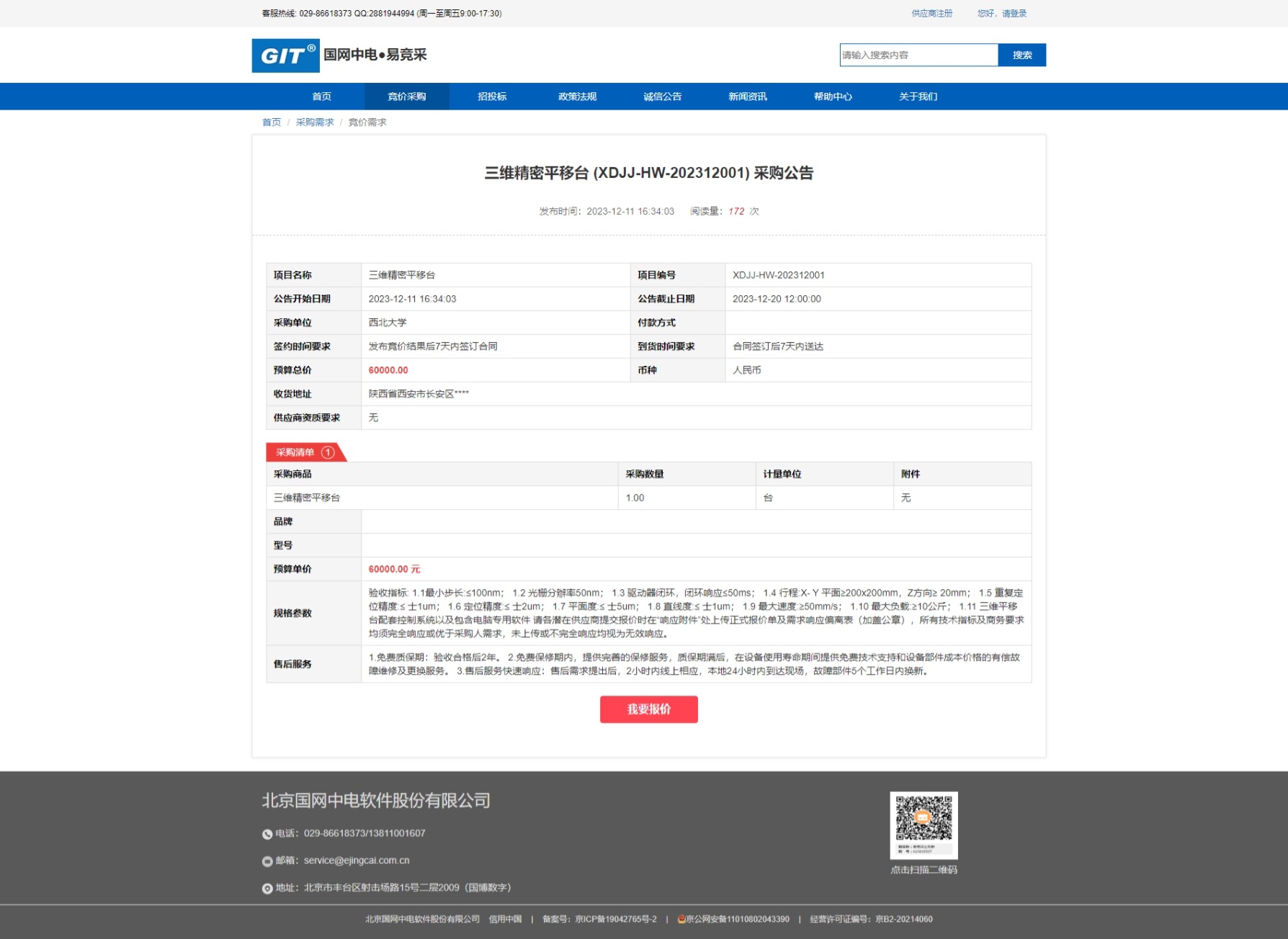 乐投在线三维精密平移台 (XDJJ-HW-202312001) 采购公告 作者: 编辑:王雯岚 时间:2023-12-19 原公告链接:https://www.ejingcai.com.cn/site/bidding/detail/7727