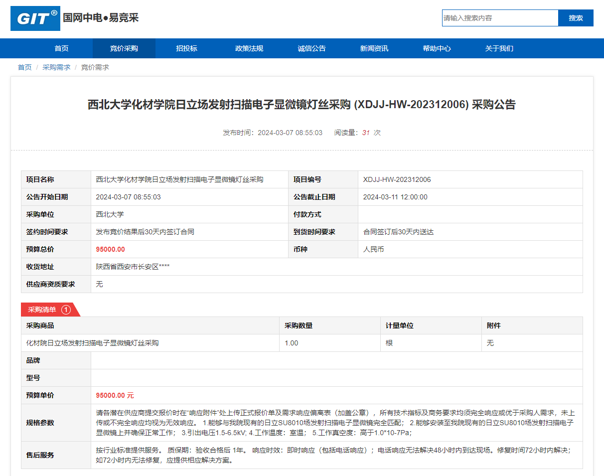 乐投在线化材学院日立场发射扫描电子显微镜灯丝采购 (XDJJ-HW-202312006)竞价公告 作者: 编辑: 时间:2024-03-07 原公告链接:https://www.ejingcai.com.cn/site/bidding/detail/8741