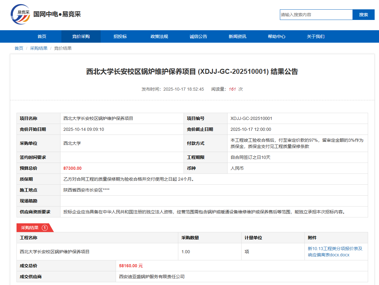 乐投在线长安校区锅炉维护保养项目(XDJJ-GC-202510001)竞价结果公告