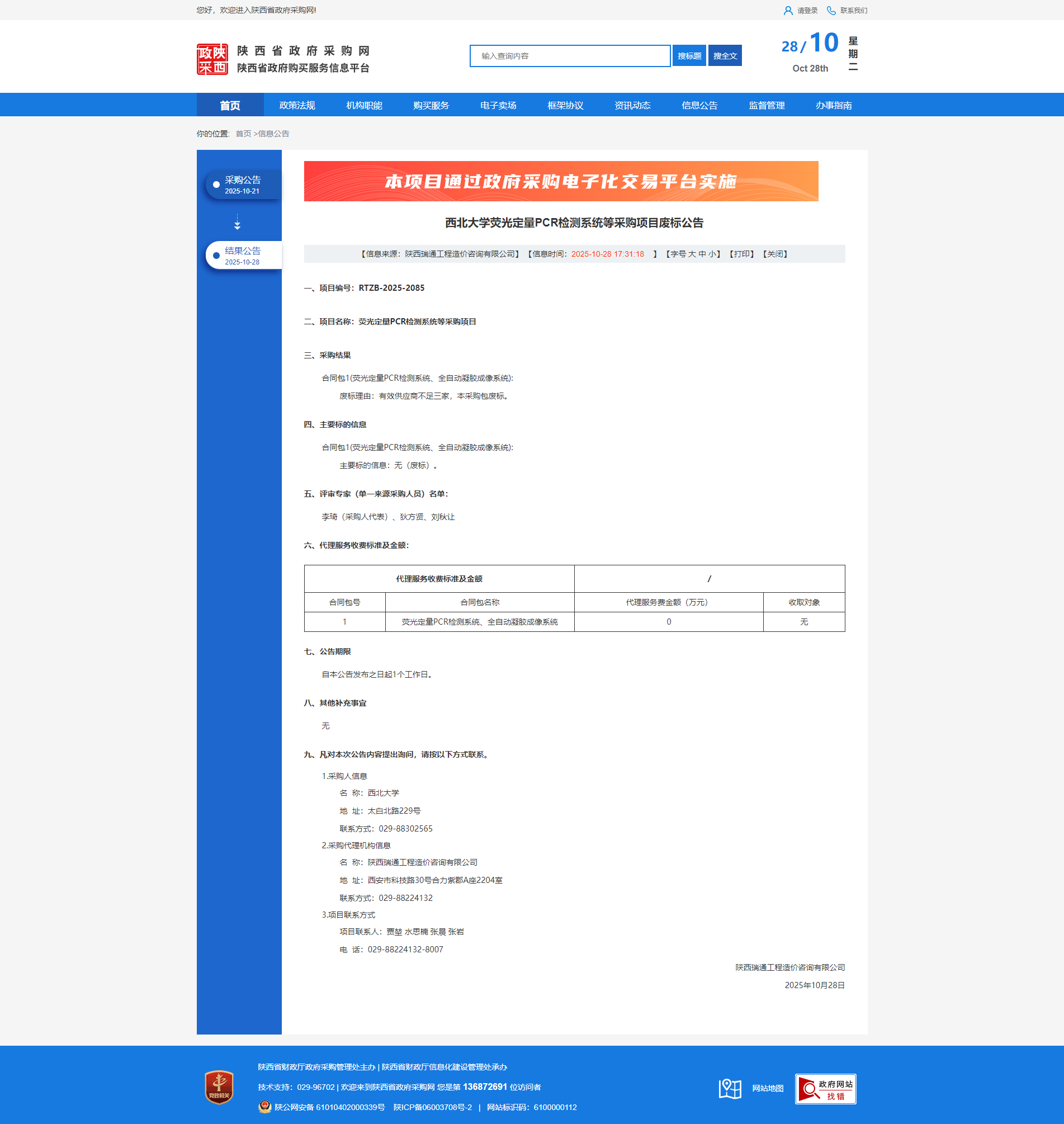 乐投在线荧光定量PCR检测系统等采购项目废标公告