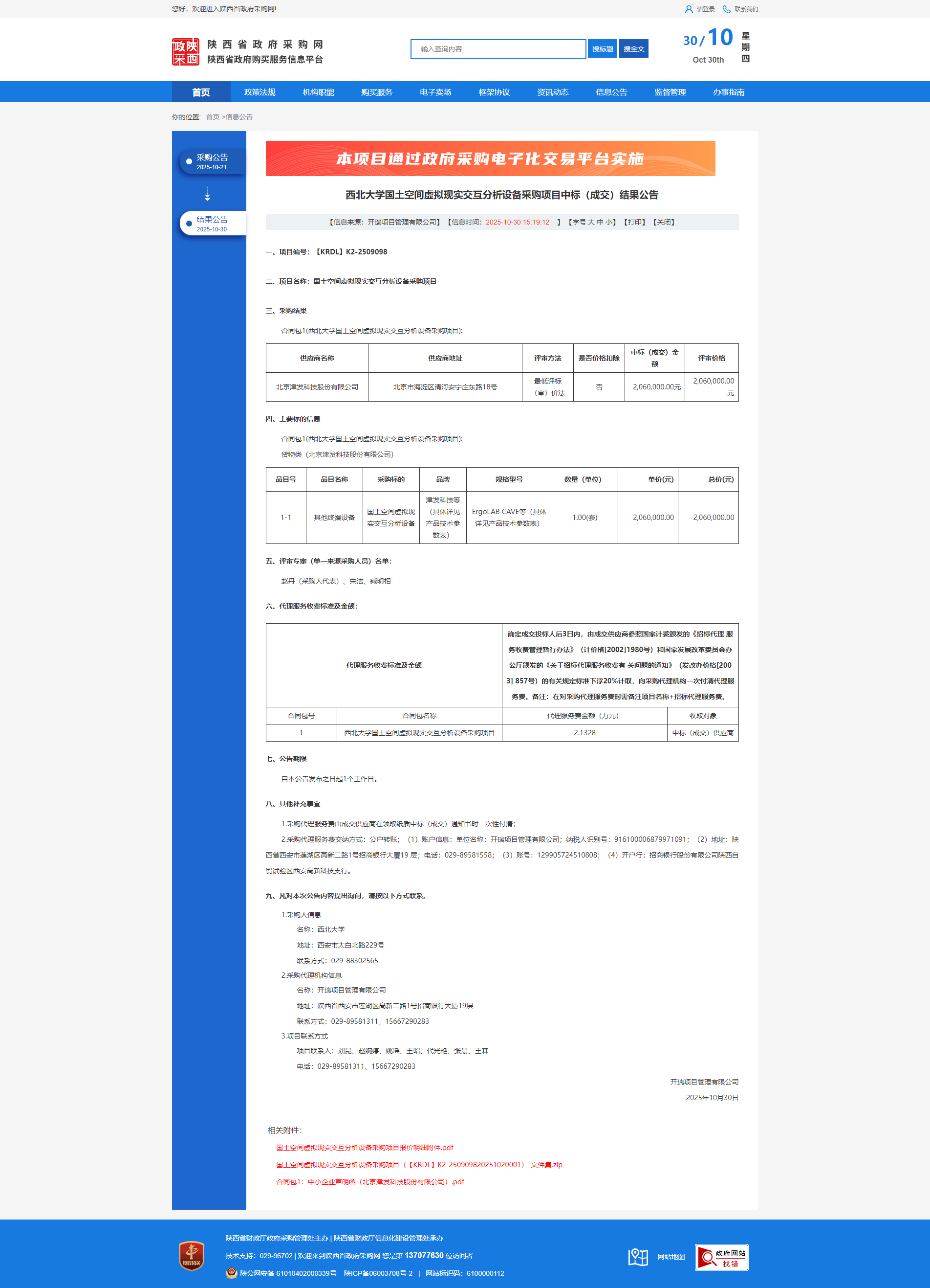 乐投在线国土空间虚拟现实交互分析设备采购项目中标(成交)结果公告