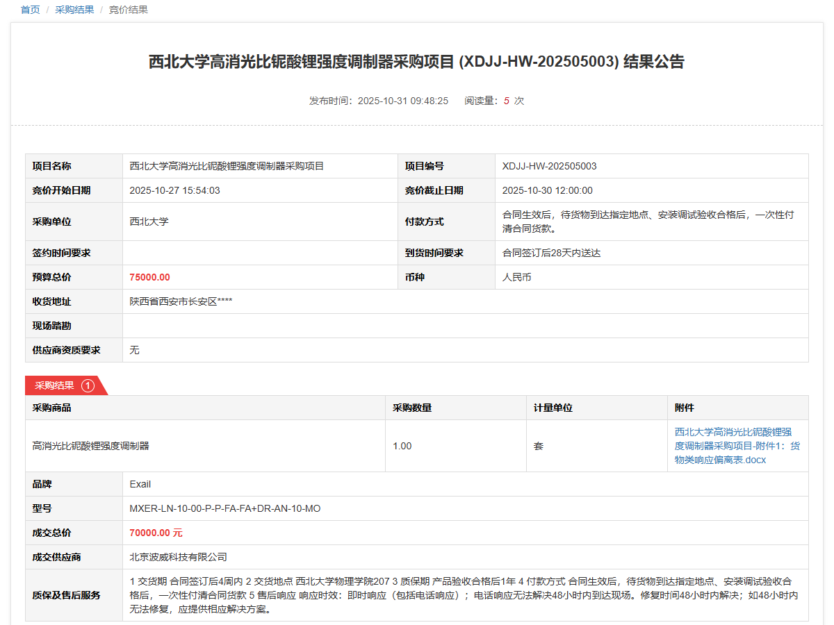 乐投在线高消光比铌酸锂强度调制器采购项目(XDJJ-HW-202505003)竞价结果公告