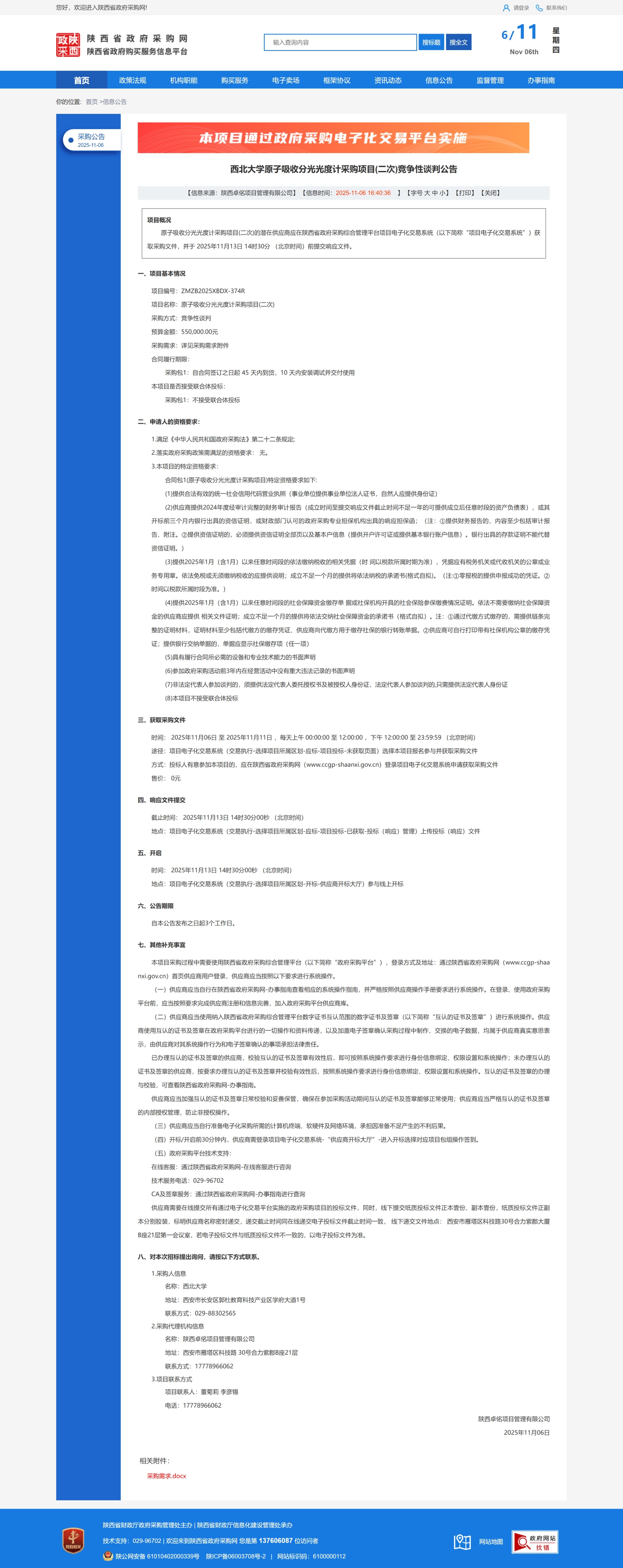 乐投在线原子吸收分光光度计采购项目(二次)竞争性谈判公告 作者: 编辑:国有资产管理处 时间:2025-11-06 原公告链接:https://www.ccgp-shaanxi.gov.cn/freecms/site/shaanxi/ggxx/info/2025/8a69c6c799f7737f019a583d8959716b.html?noticeType=001013¬iceId=79136a9c-baee-11f0-8063-08c0eb20c666
