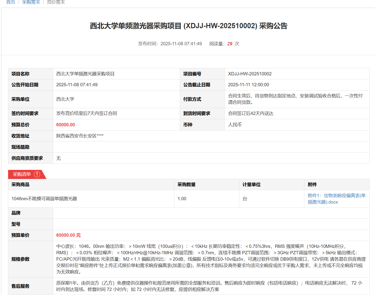 乐投在线单频激光器采购项目(XDJJ-HW-202510002)竞价采购公告